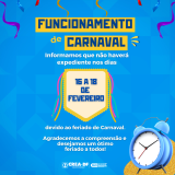 O Conselho Regional de Engenharia e Agronomia do Distrito Federal (CREA-DF) informa que não haverá expediente nos dias 16, 17 e 18 de fevereiro, em razão do feriado de Carnaval.