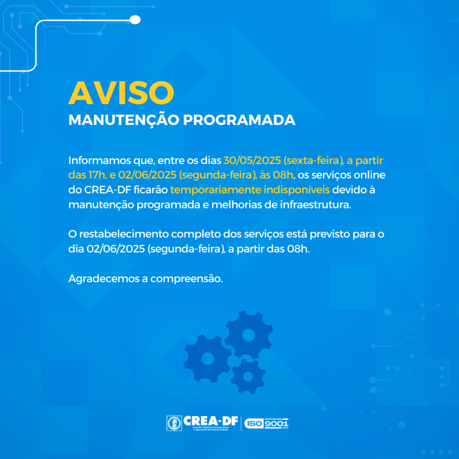 Informamos que, entre os dias 30/05/2025 (sexta-feira), a partir das 17h, e 02/06/2025 (segunda-feira), às 08h, os serviços hospedados na infraestrutura de Data Center do CREA-DF ficarão temporariamente indisponíveis devido à manutenção programada e melhorias de infraestrutura.