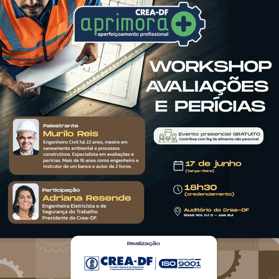 O CREA-DF promoverá no dia 17 de junho (terça-feira) mais uma edição do programa Aprimora+, com o Workshop Avaliações e Perícias. O evento será realizado no auditório do CREA-DF, com credenciamento a partir das 18h30 e início oficial às 19h.