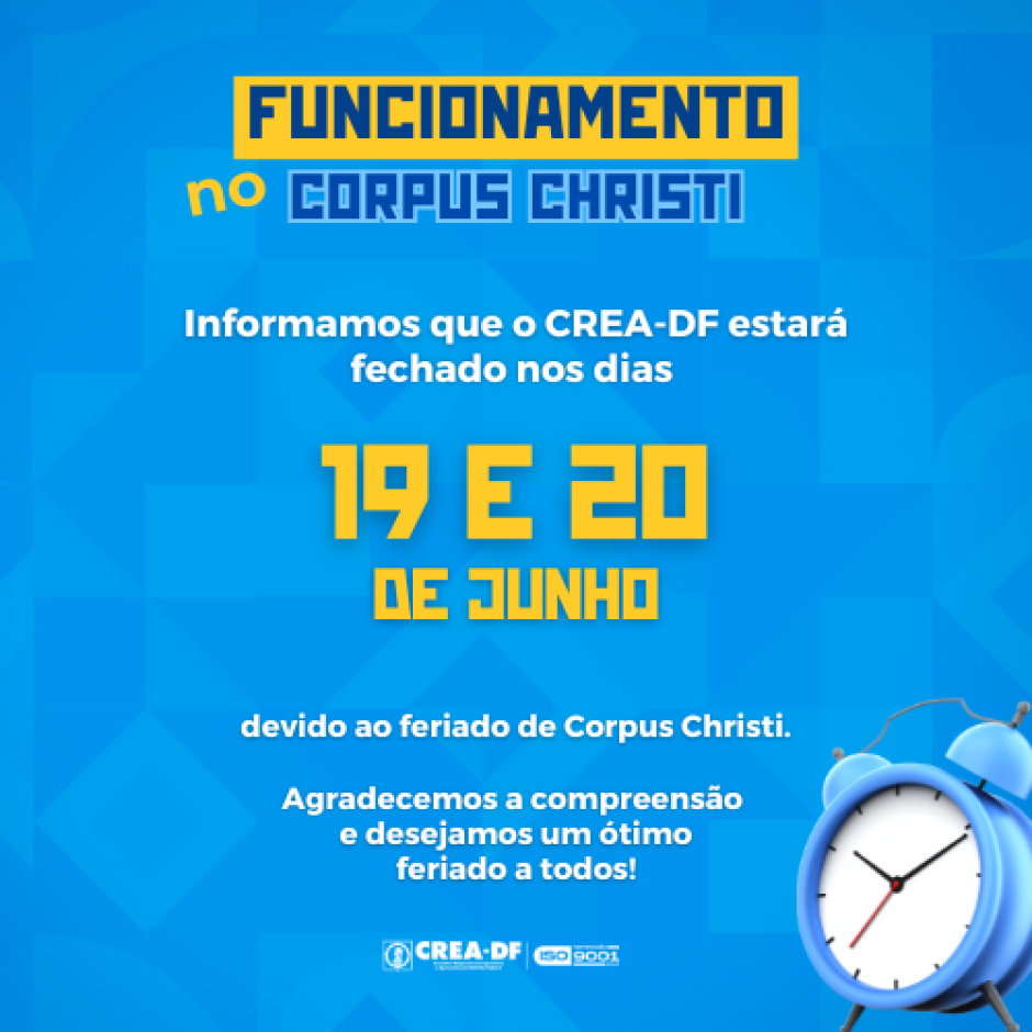 Em razão do feriado de Corpus Christi, informamos que o CREA-DF estará fechado nos dias 19 e 20 de junho.