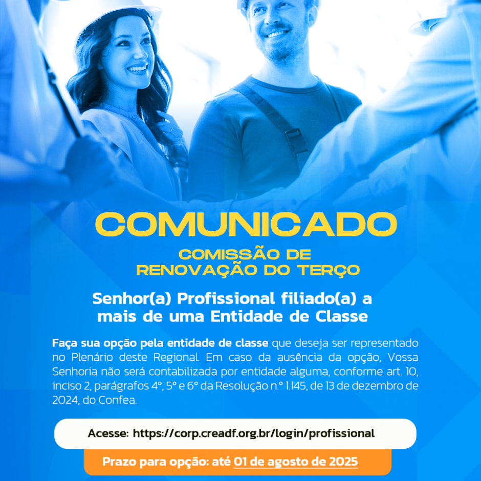 A Comissão de Renovação do Terço informa que os(as) profissionais filiados(as) a mais de uma entidade de classe devem realizar a sua opção de representação no Plenário do CREA-DF.
