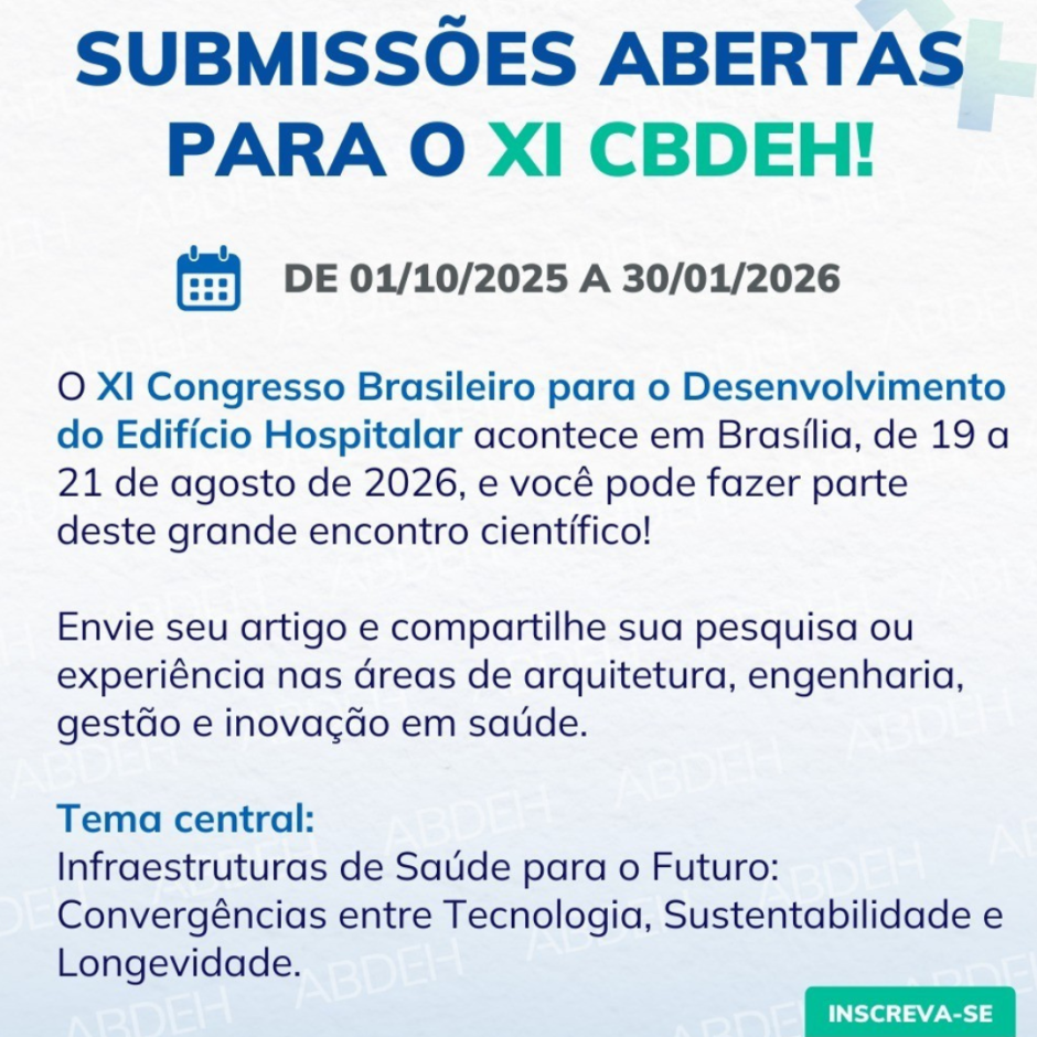 A Associação Brasileira para o Desenvolvimento do Edifício Hospitalar – ABDEH torna pública a chamada para apresentação de resumos e trabalhos no XI Congresso Brasileiro para o Desenvolvimento do Edifício Hospitalar – CBDEH, que será realizado em sua 11ª edição nos dias 19, 20 e 21 de agosto de 2026, na cidade de Brasília, Distrito Federal – Brasil.