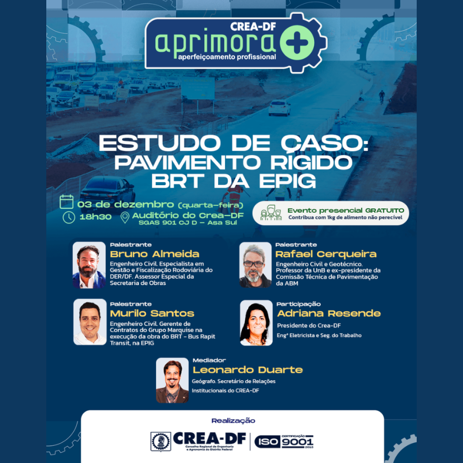 No dia 03 de dezembro, às 18h30, vamos receber especialistas para um estudo de caso sobre Pavimento Rígido no BRT da Estrada Parque Indústrias Gráficas - EPIG. Um estudo de caso aprofundado para quem deseja entender, na prática, os desafios e soluções dessa importante obra.