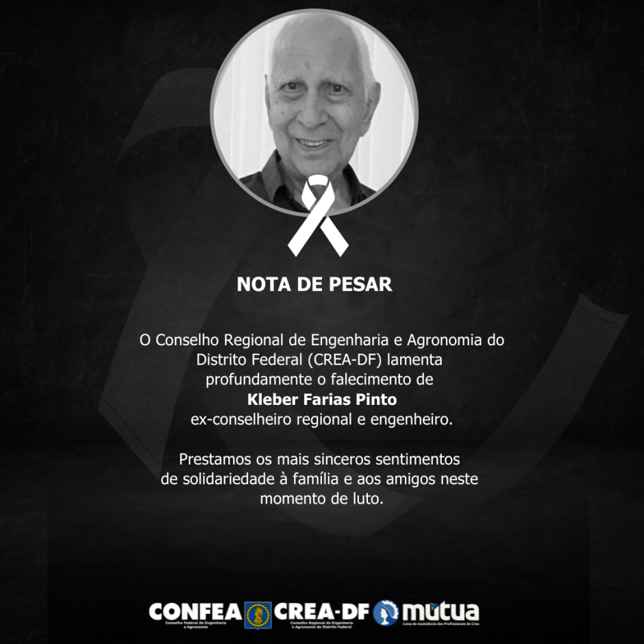 O Conselho Regional de Engenharia e Agronomia do Distrito Federal (CREA-DF) lamenta profundamente o falecimento de Kleber Farias Pinto ex-conselheiro e engenheiro, com formação e atuação nas áreas de civil, minas, metalúrgica e elétrica, dedicando sua trajetória ao fortalecimento da profissão e ao desenvolvimento do Distrito Federal.